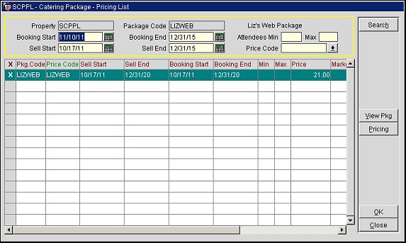 Package Code. (View Only) Displays the Package Code the catering package pricing information is being selected for. The Package Name is displayed to the right of this field.