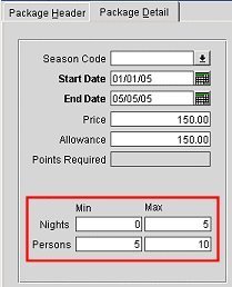 Available when the RATES > PACKAGE PRICING AND AVAILABILITY ATTRIBUTES application parameter is set to Y and the Redemption check box is not selected on the Package Header, Minimum and Maximum value fields can be specified for the number of Nights and Persons for each specified date range.