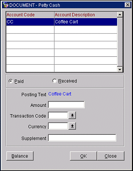 Transaction Code. Select the down arrow to choose the transaction code for this petty cash transaction. The transaction codes set up for cash payment transactions are listed on the LOV if the Paid option button was selected. The transaction codes set up for cash receipts are listed on the LOV if the Received option button was selected.