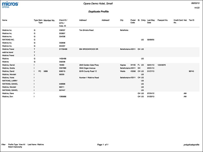 The Duplicate Profile Report displays profile address, membership and passport information to assist in determining if a duplicate profile exists in the OIS system. You may choose to match on like Name and Address information, or Membership Number, Passport Number with other match criteria. Print this report to track all duplicate profiles so you can either merge them, or purge them from the system.