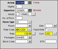 Rate. The room rate. The rate is automatically populated when you select a rate code and room type. You may select values for the Rate Code and Room Type fields individually, or you may select a rate from the Rate Query screen, in which case the Room Type, Rate Code, and Rate are auto-populated. The Rate field is highlighted in yellow when the selected rate code involves a rate change during the period of the guest's stay, and then returns to white once the rate change date is past. For example, assume the rate for the Friday through Sunday period is 150 while the rate for the period Monday through Thursday is 350. If the guest is staying for 5 nights, the Rate field will be highlighted in yellow. On Monday, the Rate field will return to white background.