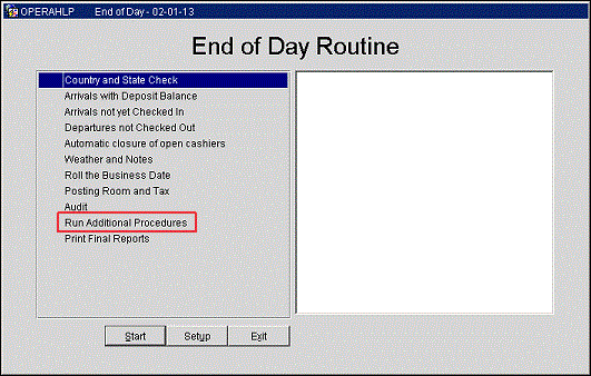 Select End of Day Sequence > Night Audit to display the End of Day Sequence procedures menu. From this menu select Run Additional Procedures to help with corrections, adjustments, and postings to guest folios as necessary.