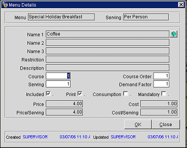 Note: If this is a Multi-choice menu and the Menu Items have the same Course and Course Order, Cost and Internal Quote will be an average, not a sum.