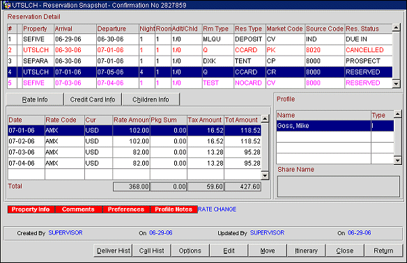 Use the Reservation Snapshot screen to review a summary of a guest's complete itinerary. The screen lists each reservation (sometimes referred to as a "leg") of the itinerary. The Reservation Snapshot screen allows you to quickly view or make changes to existing reservations.