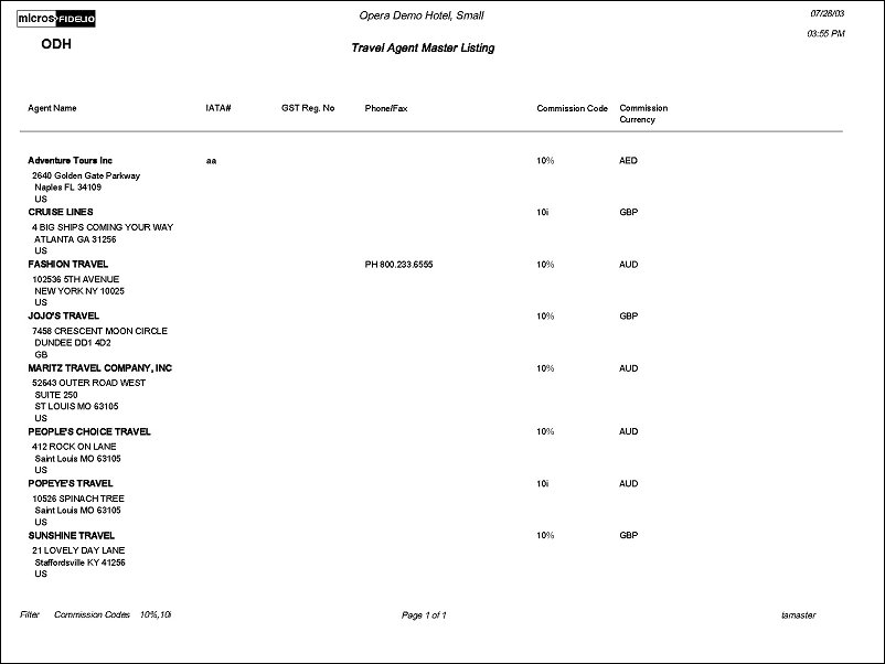 The Travel Agent Master List includes all configured Travel Agent Profiles in the Property. The information displays includes the Travel Agent Address, IATA Number, Phone Number and Commission Code.