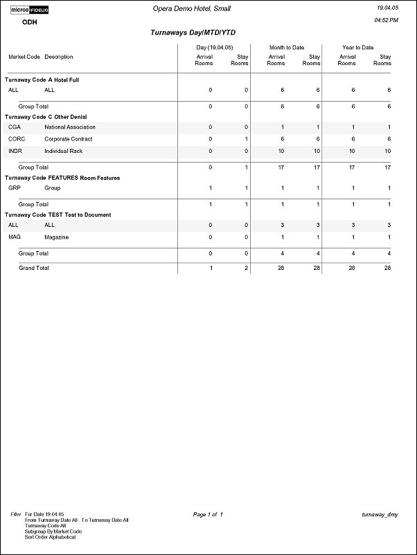 The report shows how many rooms have been turned away for a selected stay date and the MTD and YTD values, i.e. how many rooms have been turned away between the beginning of the month/year and the selected stay date. The report does NOT show when those reservations have been turned away.