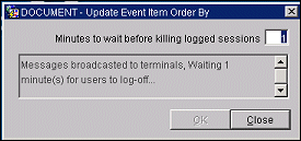To access this utility, select Utilities>Update Event Item Order By. The Update Event Item Order By screen appears, advising you that other system users must be logged out of OPERA in order for you to perform this action. The screen prompts you to initiate a message directing users to log out before any active sessions are automatically terminates after an amount of time you specify. Enter the Minutes to wait and select the OK button.