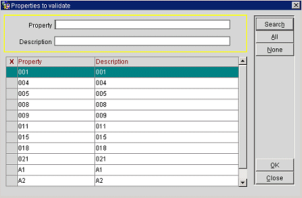 Once you have selected the type of validation a list of values for all properties will be available. Select all or choice properties to validate. Select OK button to start the validation.