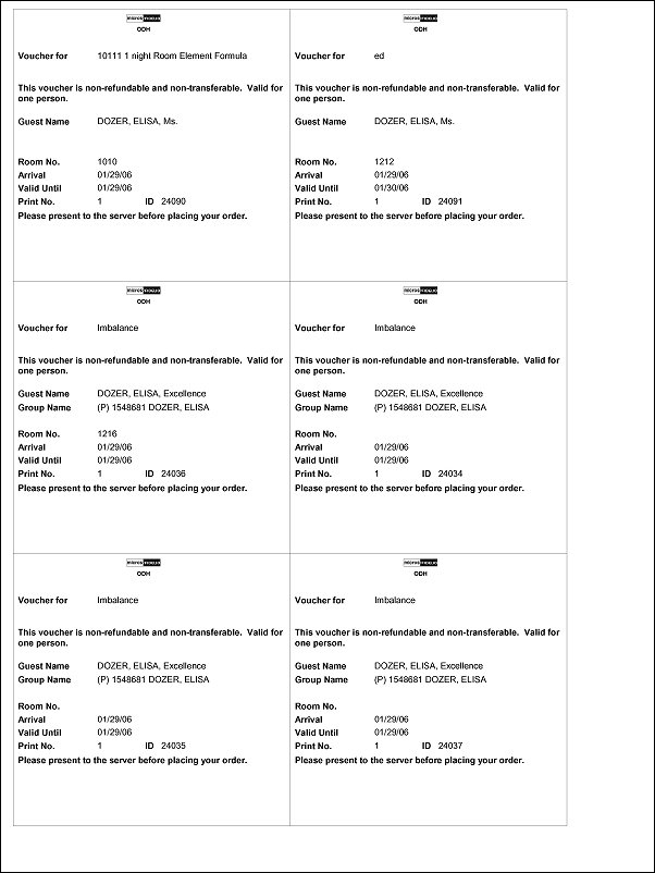 You can print Meal Vouchers for today, days in advance, or for guests in-house. The vouchers are for one person and are based upon the package elements and forecasted package elements that have been defined from the rate code and/or package setup. These are printed according to the posting rhythm. At any time when it is required to choose Arrival or In House, OPERA automatically updates the reservations (arrivals or in house), for example, a new reservation prints and if an in-house reservation has extended the departure date. On the original reservation days the vouchers is noted that they are reprinted and the new ones show a new voucher number.